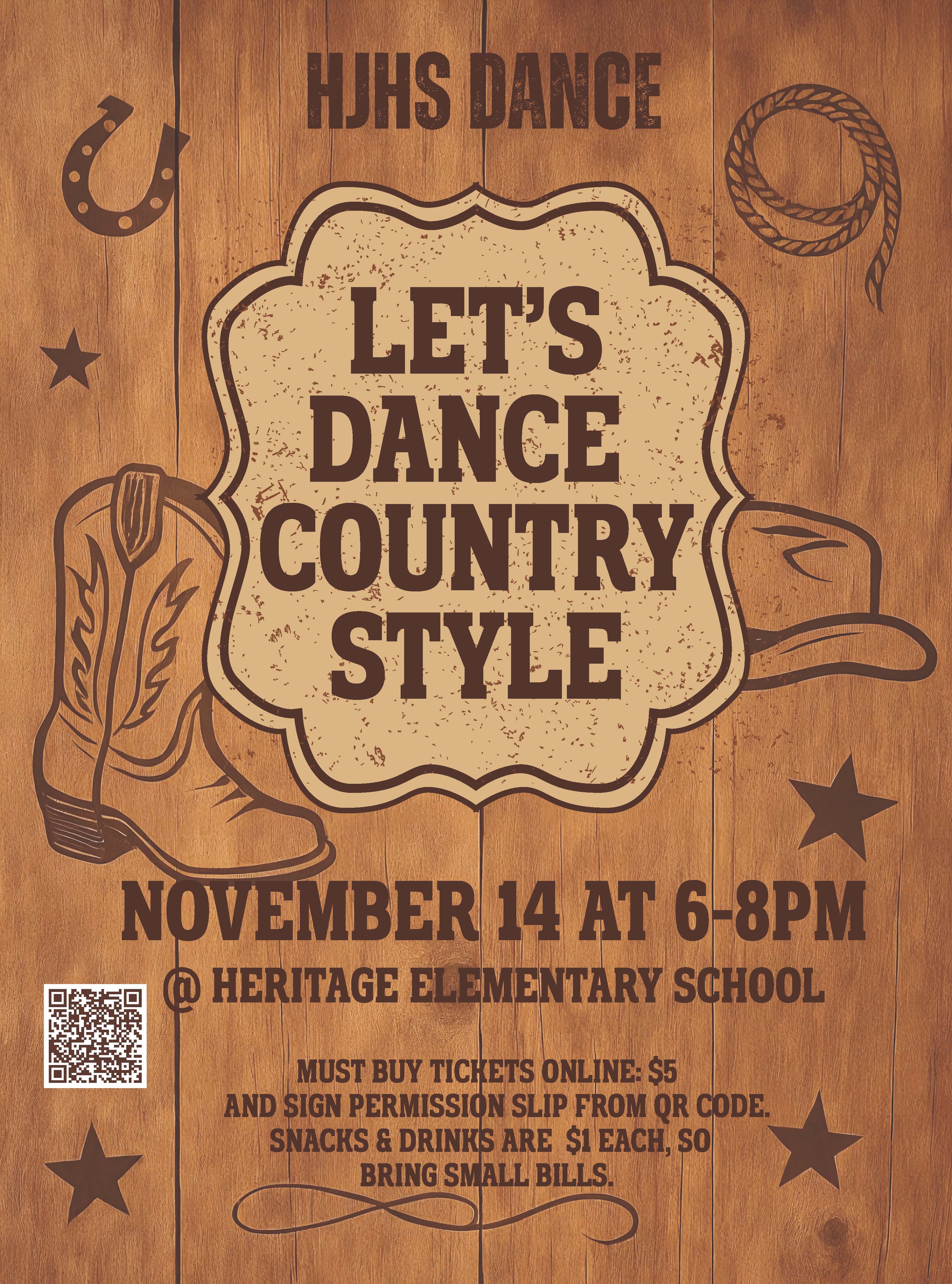 Students will not want to miss our fall junior high dance on Friday, November 14, 2025. Middle school students from both Heritage Junior High and Heritage Flex Academy will be showing off their dance moves from 6:00–8:00 p.m. in the Heritage Elementary MPR (1855 E. Valley Parkway, Escondido). This year's theme is country western, so pull out your cowboy boots and your favorite plaid and denim. Snacks will be available for purchase with all proceeds going to the HJHS Leadership Club. Please bring small bills for your snack purchases! Tickets cost $5 and may ONLY be purchased online in advance of the event. Please click HERE
